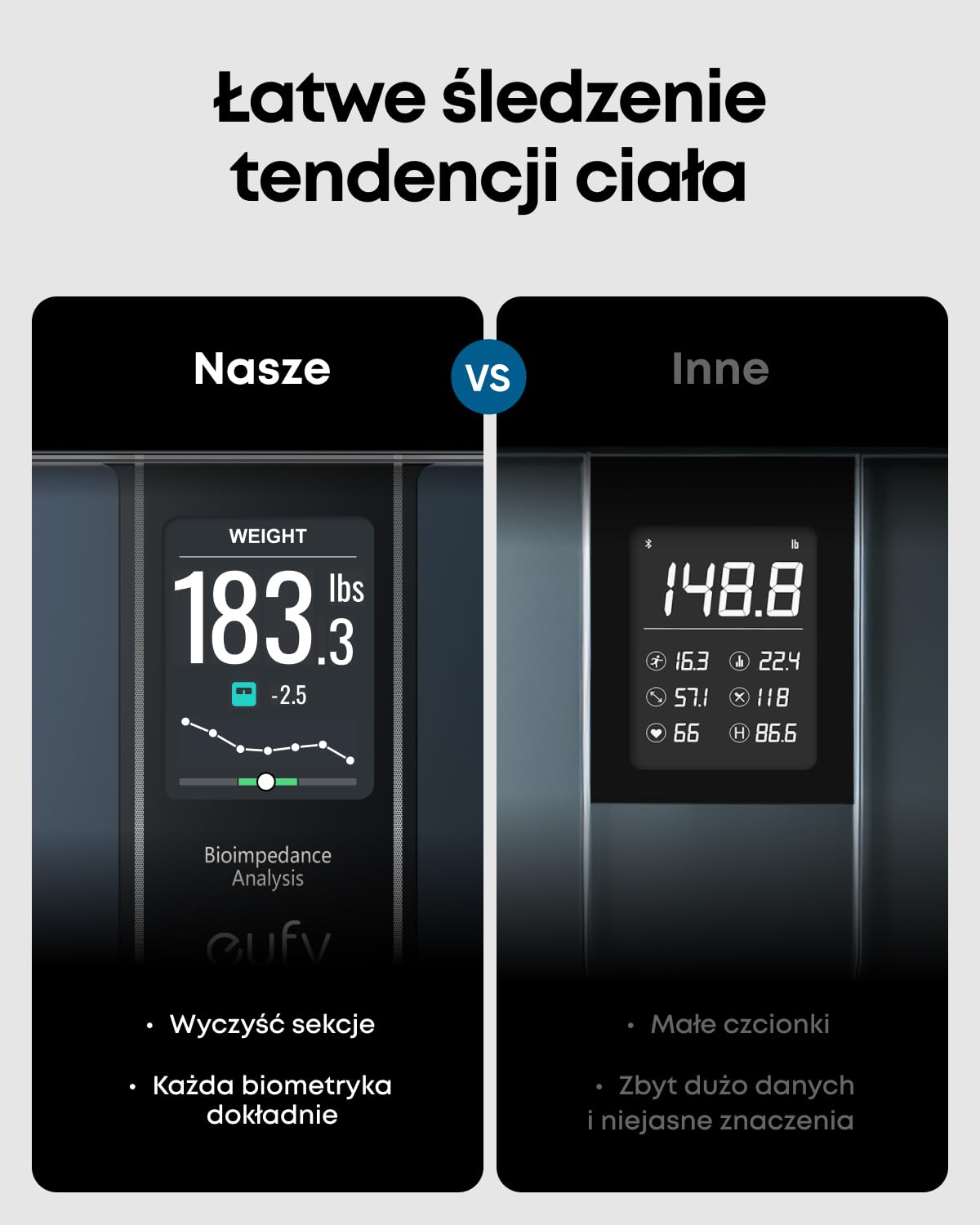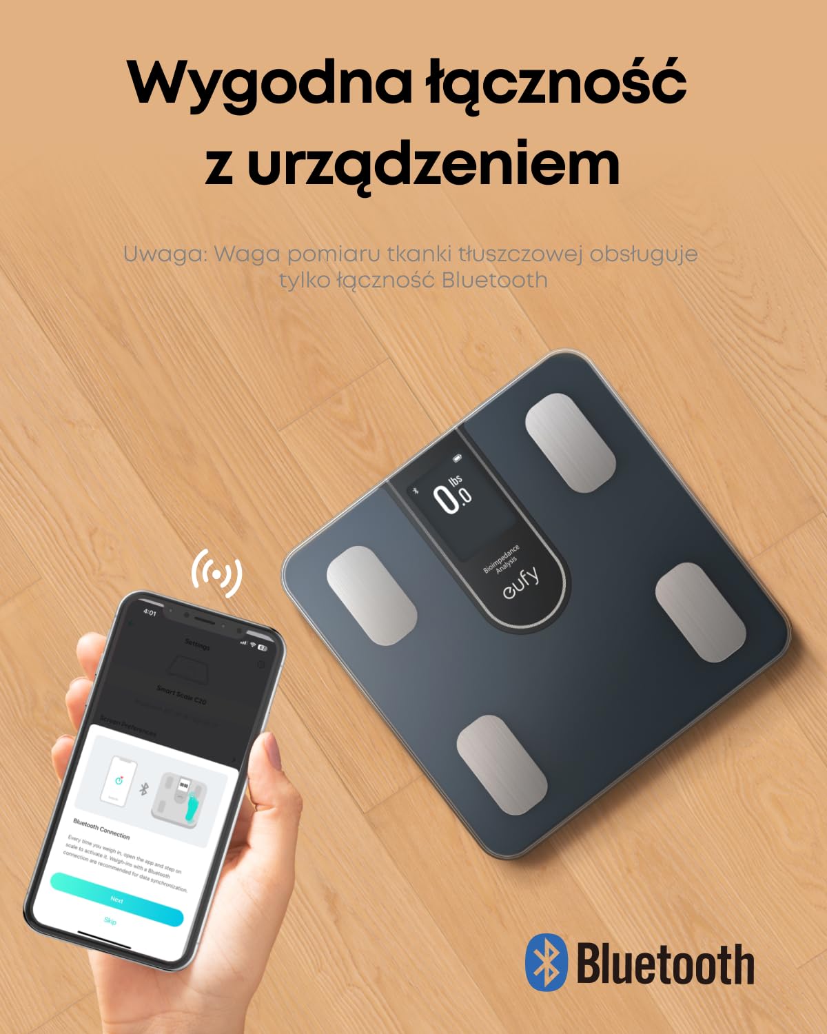 Wysoka dokładność. Nasza waga posiada antypoślizgową podstawę i cztery zaawansowane czujniki, co zapewnia precyzyjne pomiary masy ciała do 0,1 lb (0,05 kg).