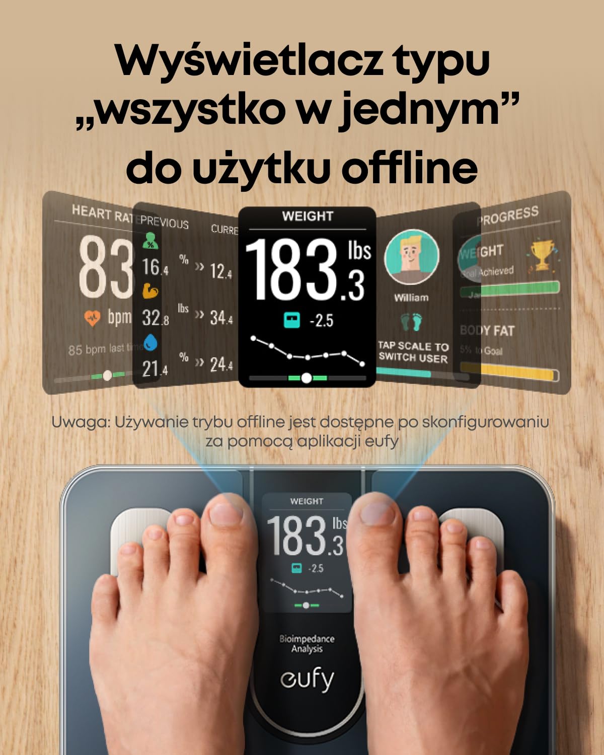 Wyświetlacz typu „wszystko w jednym” do użytku offline. Najważniejsze informacje bezpośrednio u twoich stóp. Postępy w czasie rzeczywistym bez potrzeby korzystania z telefonu. Motywuje i pozwala skupić się na drodze do zdrowia. Używanie trybu offline jest dostępne po skonfigurowaniu za pomocą aplikacji eufy Life.