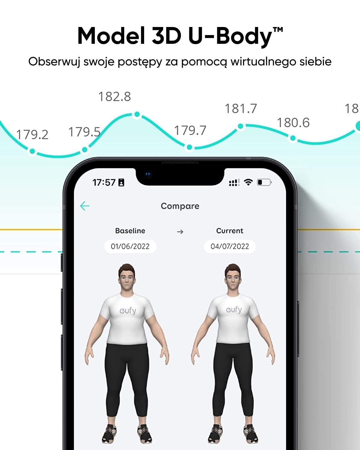 Obserwuj postępy swojego ciała w trakcie podróży do zdrowia dzięki wirtualnemu modelowi 3D U-Body reprezentującym ciebie. Twój awatar dopasuje proporcje i wymiary bicepsów, klatki piersiowej, talii, bioder oraz ud, które wprowadzisz, a następnie przedstawi szczegółowy obraz zmian.
