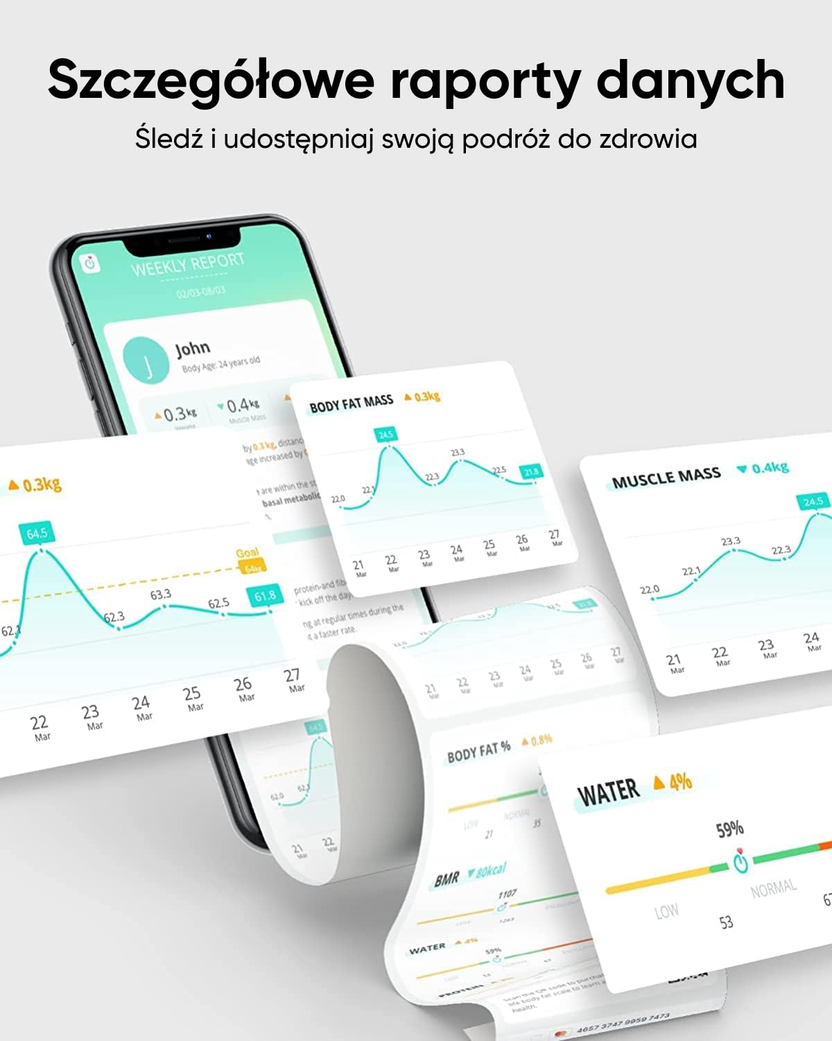 Analiza budowy całego ciała. Śledź swoje codzienne postępy i monitoruj 16 szczegółowych pomiarów swojego ciała, w tym wagę, tkankę tłuszczową, BMI, masę mięśniową, masę kostną, a nawet tętno.