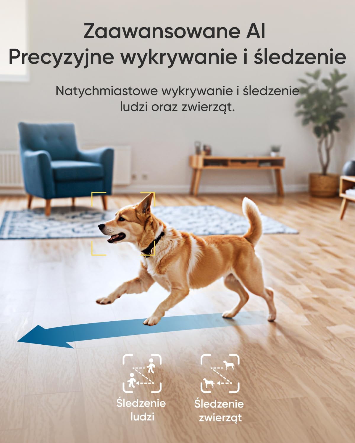 Wykrywanie i automatyczne śledzenie wspomagane przez sztuczną inteligencję: – Zaawansowana sztuczna inteligencja w urządzeniu precyzyjnie identyfikuje ludzi, zwierzęta, dźwięki i płacz. Po wykryciu śledzi ruch, aby szczegółowo monitorować jego położenie.