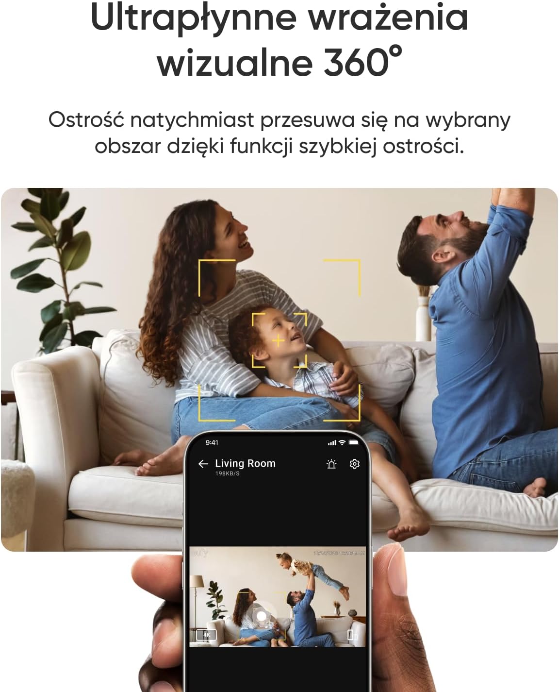 Panoramiczny widok 360°. Łatwo przeglądaj widok swojego domu dzięki nowym funkcjom aplikacji, takim jak szybka ostrość i widok panoramiczny, umożliwiającym natychmiastową zmianę ostrości poprzez dotknięcie odpowiedniego obszaru na ekranie.