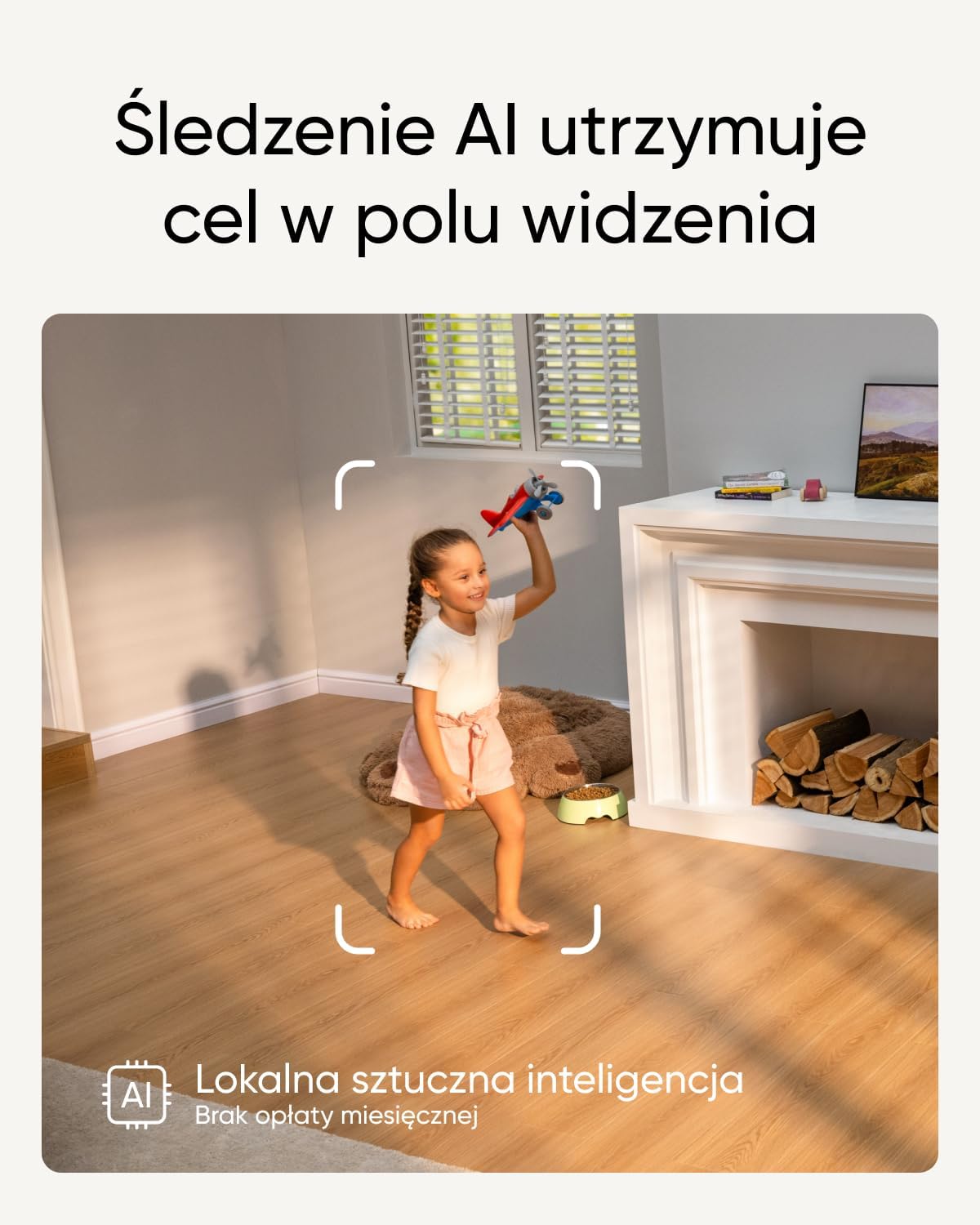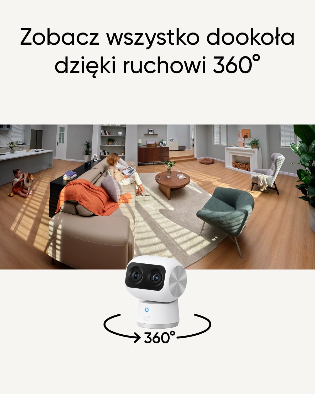 Inteligentne śledzenie dzięki algorytmowi opracowanemu przez eufy Security, funkcja śledzenia oparta na sztucznej inteligencji umożliwia kamerze podążanie za członkami rodziny oraz pupilami po całym pomieszczeniu.