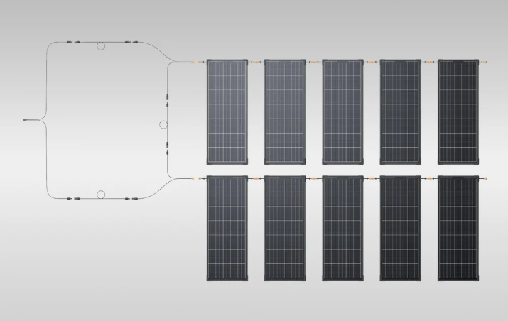 Instalację można rozbudować do maksymalnie 10 paneli połączonych równolegle, co pozwala osiągnąć łączną moc sięgającą 1300 W. Każdy moduł charakteryzuje się napięciem obwodu otwartego 51 V oraz prądem zwarciowym 3,2 A, co sprzyja sprawnemu przesyłowi energii przy relatywnie niskim natężeniu. Napięcie robocze na poziomie 43 V umożliwia współpracę z systemami wysokonapięciowymi, w tym przenośnymi stacjami zasilania EcoFlow oraz kompatybilnymi instalacjami zewnętrznymi. Taka konfiguracja ułatwia stopniową rozbudowę systemu i pomaga ograniczyć straty energii podczas przesyłu.