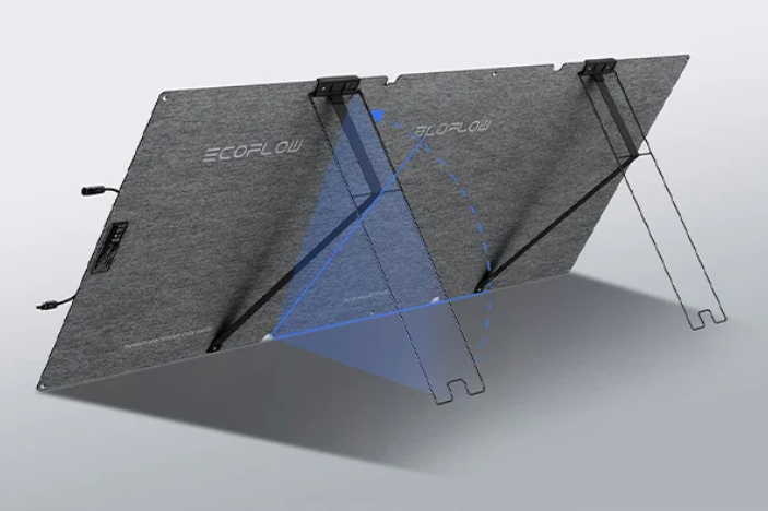 Znamionowa moc 160 W oraz sprawność na poziomie 25% zapewniają szybkie i niezawodne ładowanie. Panel fotowoltaiczny EcoFlow został wyposażony w zintegrowane podpórki, które umożliwiają regulację kąta nachylenia w trzech pozycjach: 30°, 60° oraz 90°. Dodatkowo wbudowany wskaźnik kąta padania promieni słonecznych ułatwia precyzyjne ustawienie panelu, pozwalając maksymalnie wykorzystać dostępne światło i zwiększyć efektywność pracy.