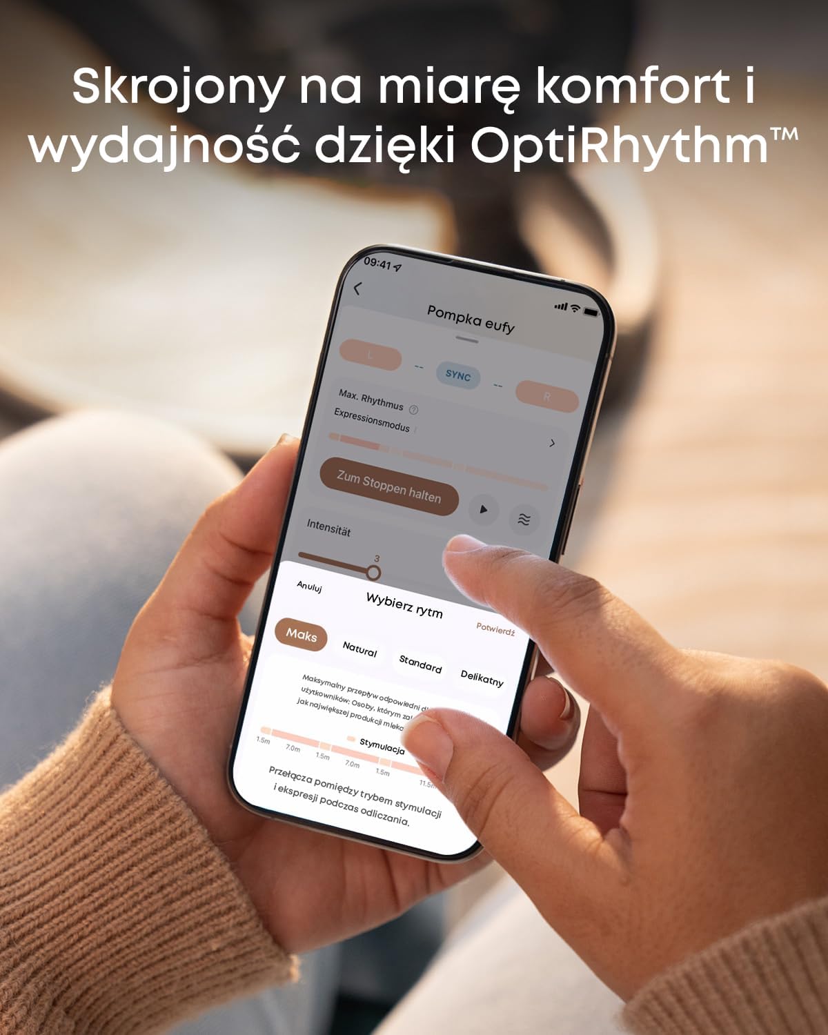 Inteligentne odciąganie pokarmu, idealnie dopasowane. Dzięki inteligentnym funkcjom aplikacji eufy Baby i technologii OptiRhythm można precyzyjnie dostosować rytm, siłę i prędkość odciągania pokarmu. Zdalne sterowanie laktatorem zapewnia większy komfort i elastyczność.