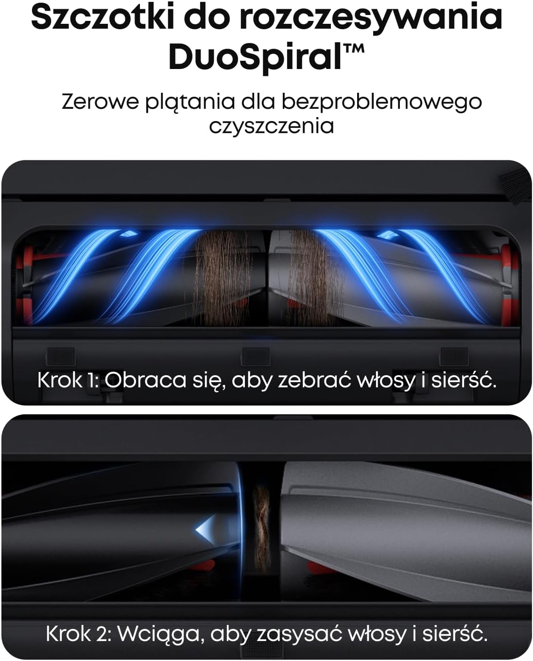 Szczotki DuoSpiral zapobiegają plątaniu się włosów i zmniejszają częstotliwość konserwacji, zapewniając bezproblemowe czyszczenie.