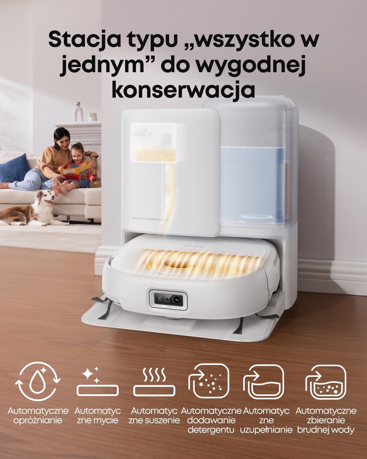 Dzięki samoczynnemu opróżnianiu, myciu, suszeniu gorącym powietrzem, dozowaniu detergentu, zbieraniu wody po myciu i napełnianiu możesz cieszyć się wygodnym sprzątaniem.
