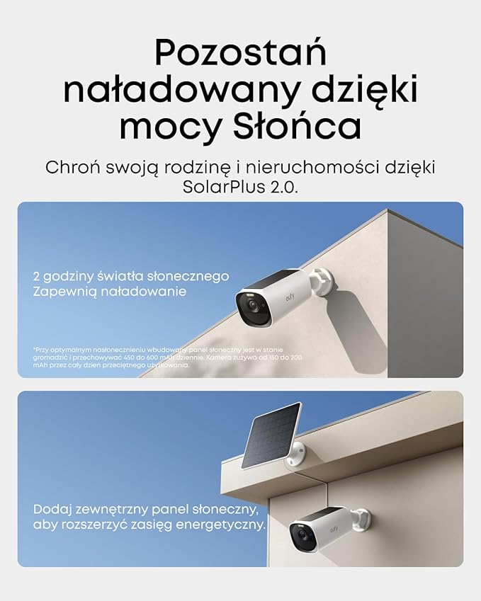 Technologia SolarPlus 2.0 gwarantuje ciągłe działanie urządzenia dzięki efektywnemu wykorzystaniu energii słonecznej. Możesz korzystać z wbudowanego panelu lub podłączyć dodatkowy, aby zwiększyć możliwości ładowania. Kamera pozostaje aktywna nawet przy ograniczonym nasłonecznieniu, np. w pochmurne dni lub w miejscach częściowo zacienionych.