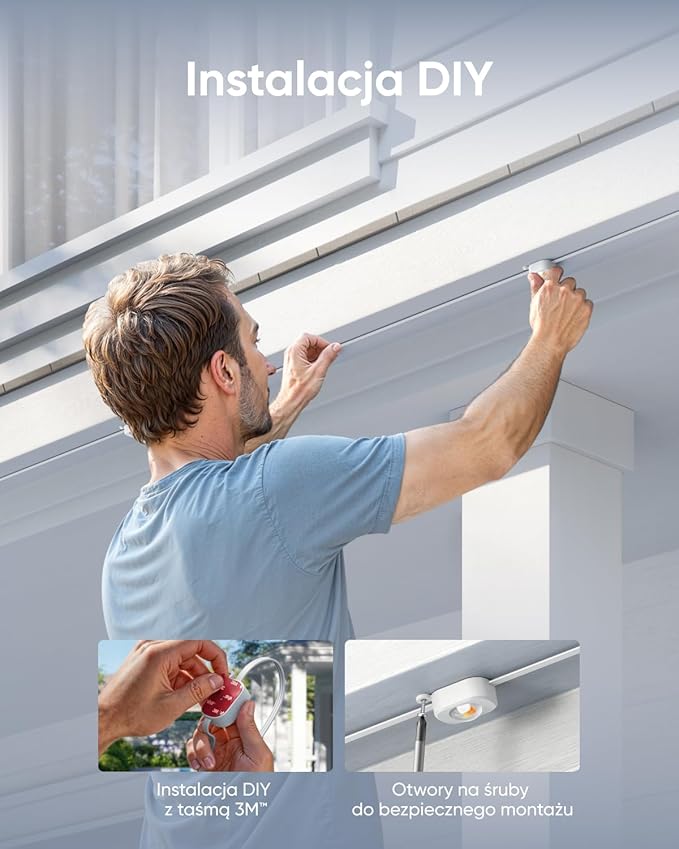Łatwa instalacja DIY Taśma przykleja się do większości powierzchni i zawiera otwór na śrubę dla dodatkowego wzmocnienia. Dzięki temu można bezpiecznie zainstalować światła szybciej i przy minimalnym wysiłku.