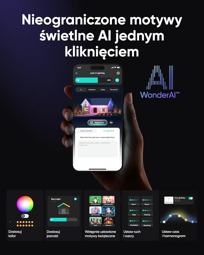 Oświetlenie sterowane przez sztuczną inteligencję: dzięki aplikacji eufy Life możesz w mgnieniu oka zmienić wystrój swojego domu. Sztuczna inteligencja tworzy indywidualne motywy świetlne na uroczystości, nastroje lub specjalne okazje w oparciu o Twoje preferencje, tworząc niepowtarzalną atmosferę.