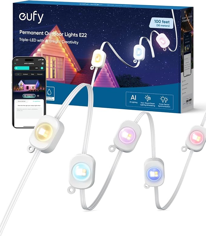 Nowoczesne, trwałe i energooszczędne oświetlenie zewnętrzne LED od Eufy. Model E22 to idealne rozwiązanie do ogrodu, tarasu czy podjazdu – oferuje stałe, efektowne światło z możliwością sterowania przez aplikację. Wysoka odporność na warunki atmosferyczne (IP67) i prosty montaż sprawiają, że to niezawodny wybór na lata.